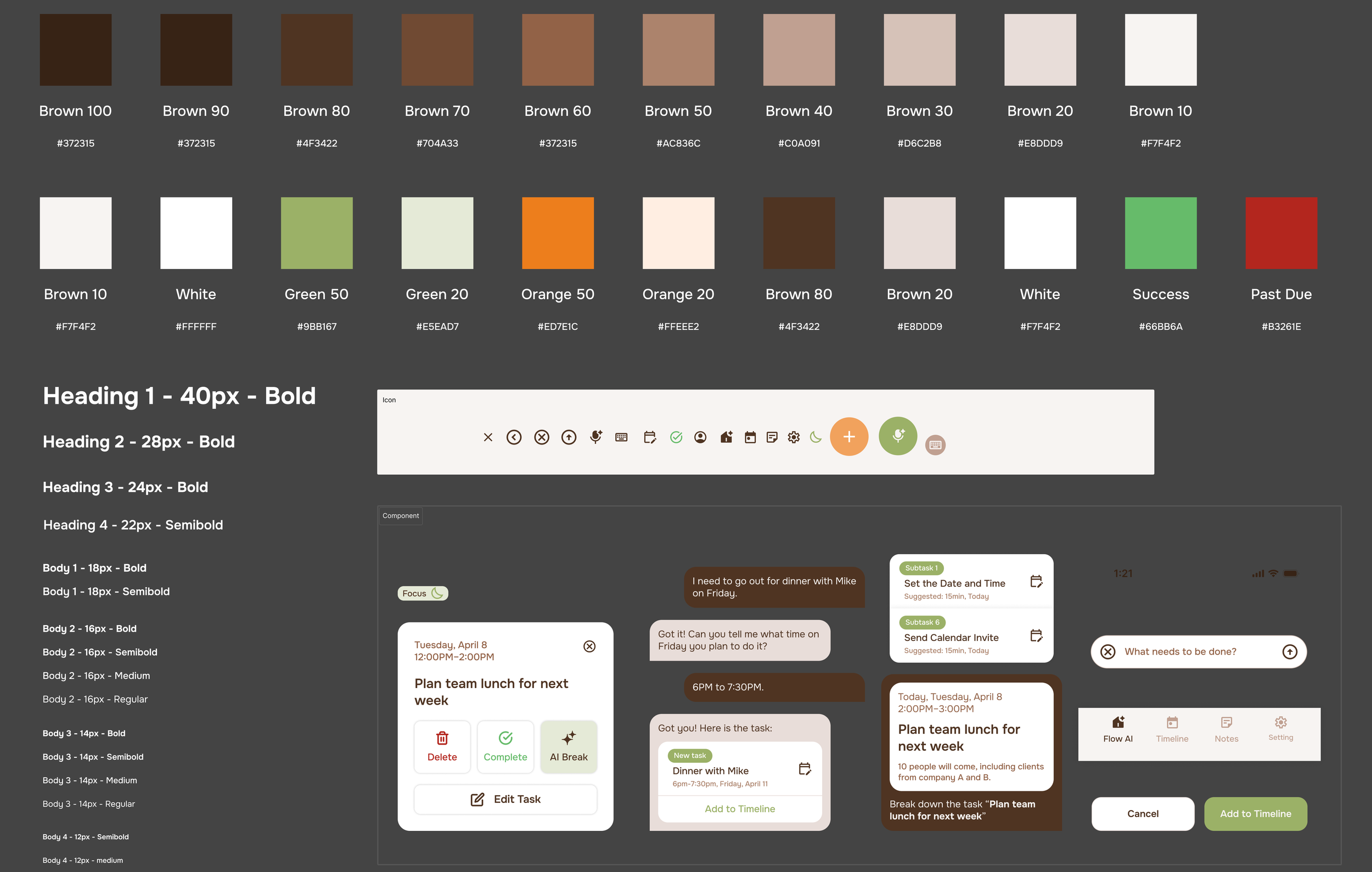 Visual Design: We chose green and brown as the primary brand colors, using softer, less intense tones. The visual design reinforces our brand identity: Flowday – clarity for your overloaded brain & lightweight planning.