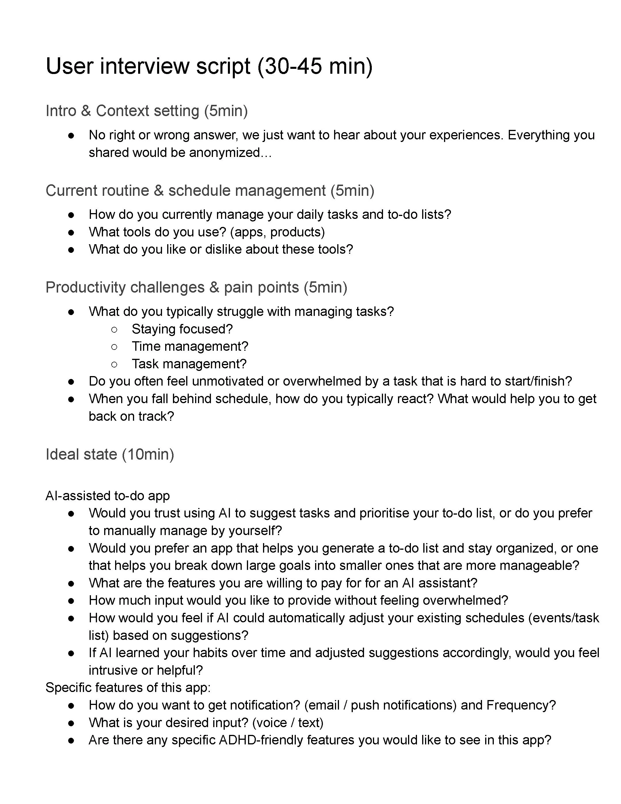 Interview Script: Focused on daily habits, frustrations, and expectations for productivity tools.