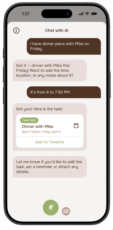 We prioritized voice input while still providing a text input option. Users can speak their task and let the AI generate it for them.