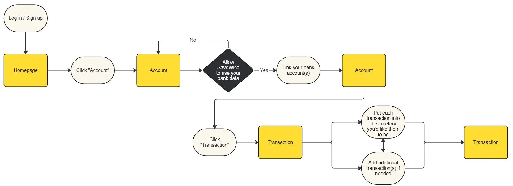 With the user research and user pain points in mind, I came up with a structure for SaveWise.