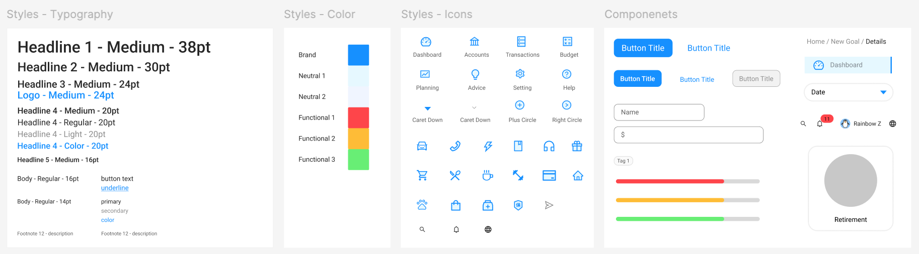 After sketching the paper wireframes, I moved on to creating digital wireframes. First, I designed a UI kit for SaveWise.