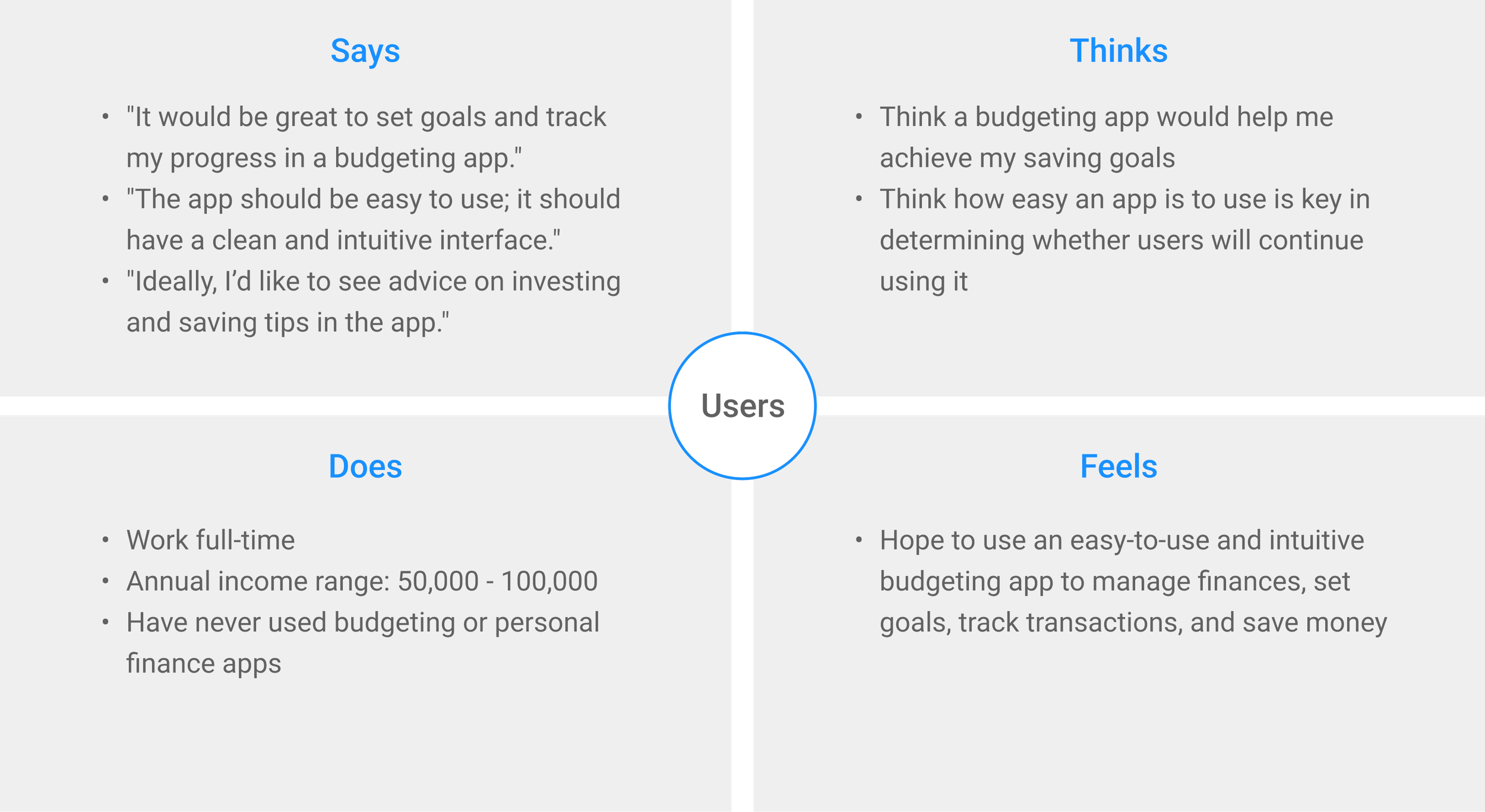 Candidates provided valuable insights on what features they find useful in existing budgeting apps, such as the monthly budget feature, conditional formatting, pivot table, data visualization, the ability to set goals, etc.