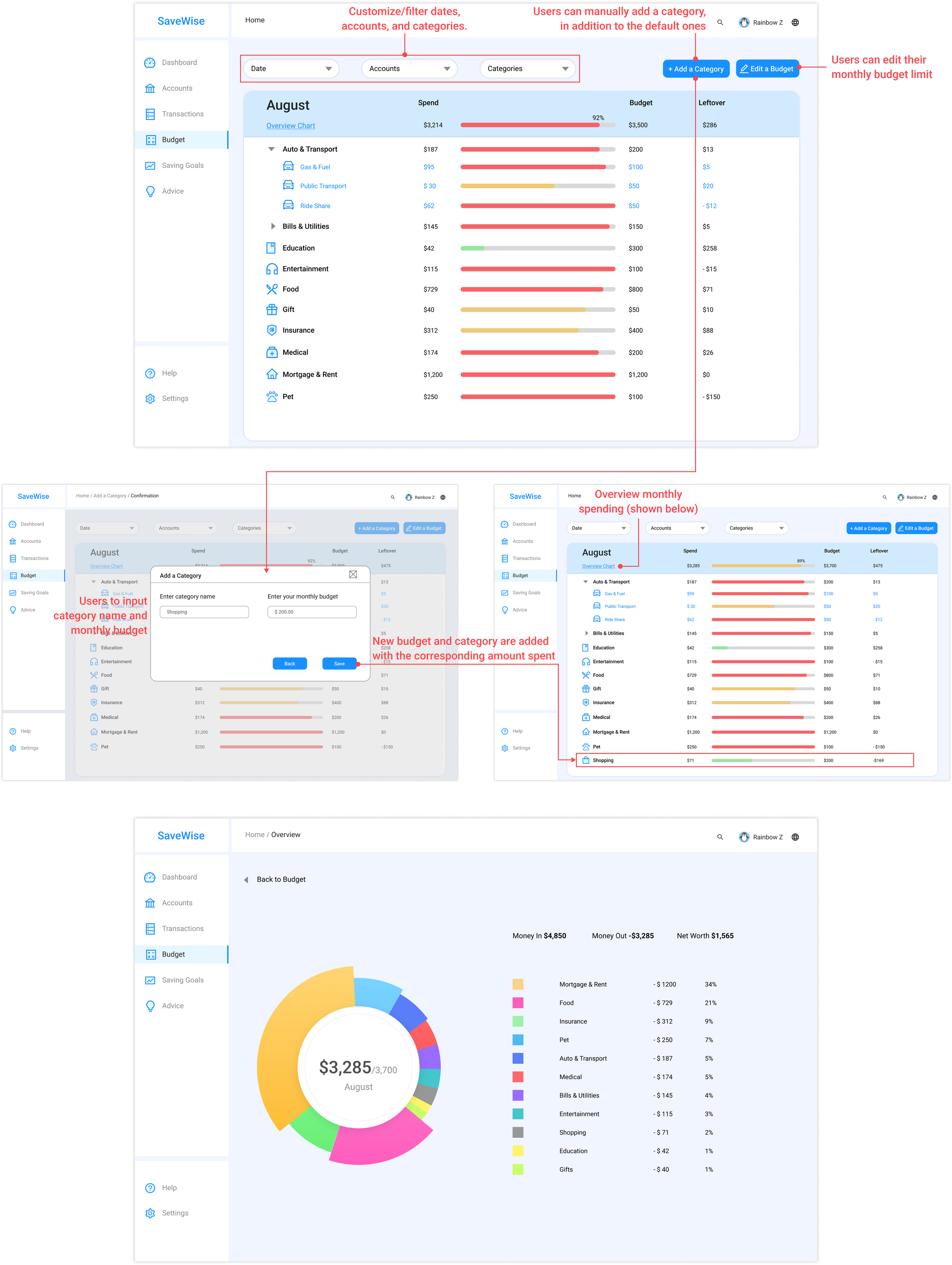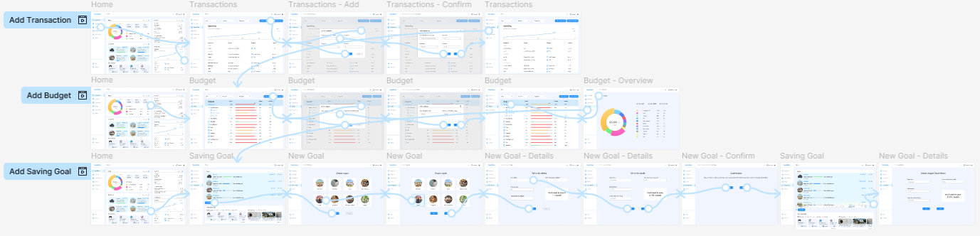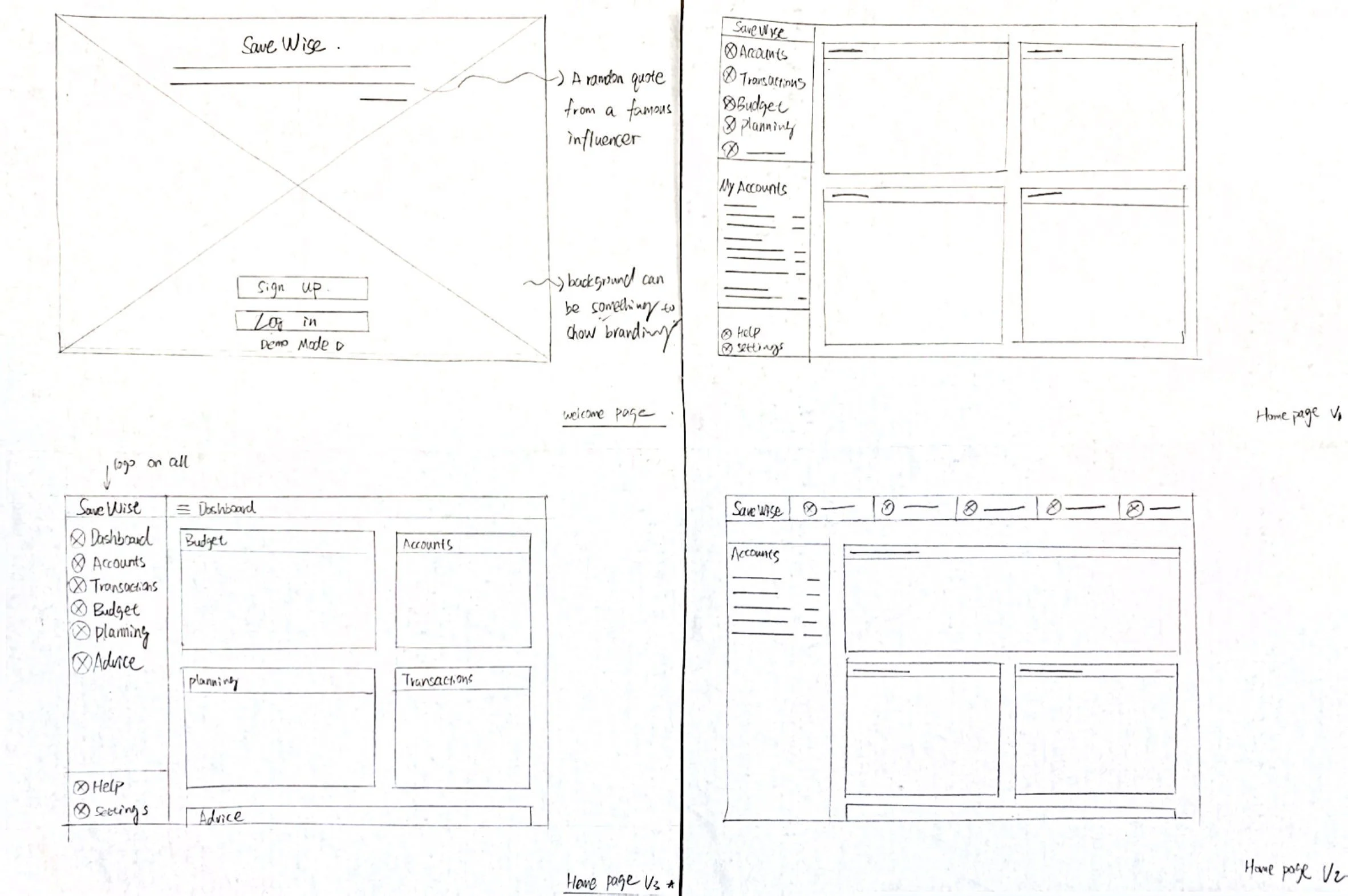 I sketched different versions of the dashboard, budgeting page, and saving goals page, focusing on users’ needs. I included all the main features I wanted to highlight in these sketches.
