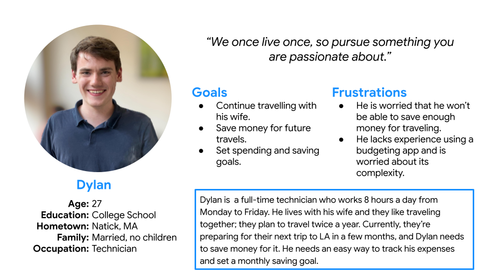 Dylan is a full-time technician who needs an intuitive and easy-to-navigate budgeting app, as he has never used one before. He wants to set up a monthly spending goal and save for his next vacation.