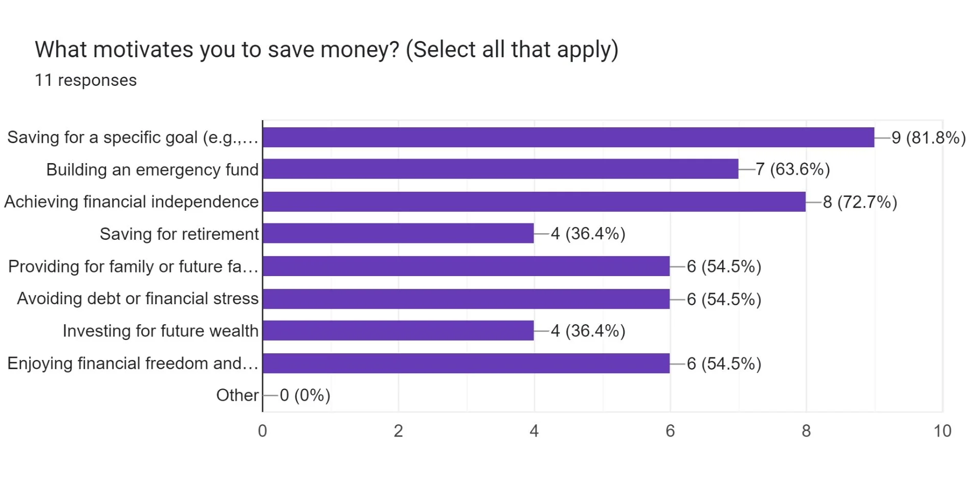 9 out of 11 chose saving for a specific goal, 7 out of 11 chose achieving financial independence, and 6 out of 11 chose providing for family or future family, investing for future wealth, and enjoying financial freedom and flexibility.
